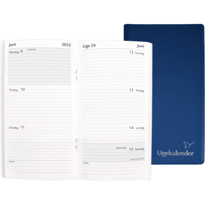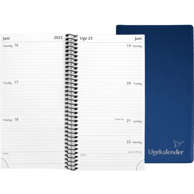 Månedskalender 2025 med kalender, telefonregister og notesblok, blå
