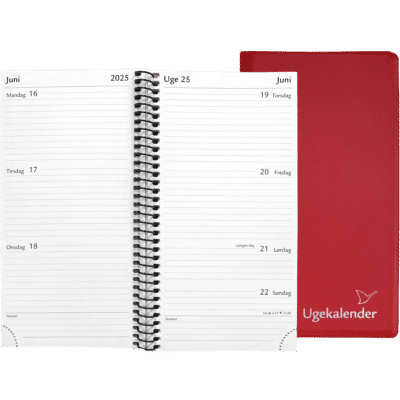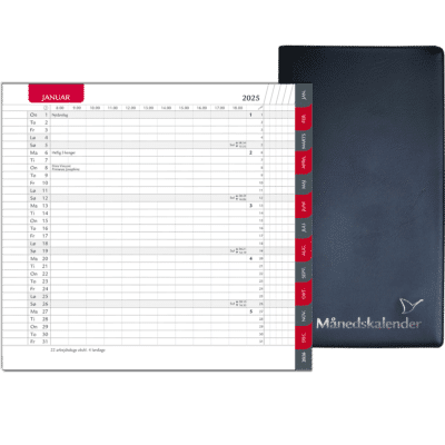Månedskalender 2025 med kalender, telefonregister og notesblok, rød