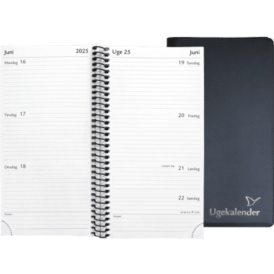 Månedskalender 2025 med kalender, telefonregister og notesblok, sort