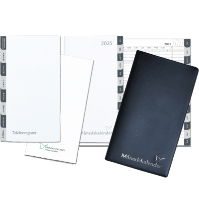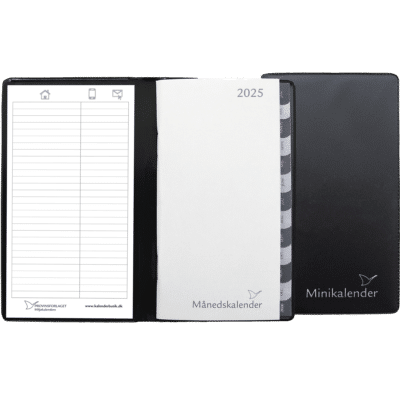 Månedskalender 2025 med kalender, telefontavle og notesblok, sort