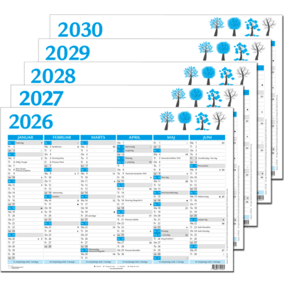 For dig, der gerne vil planlægge længere ud i fremtiden, er vores 5 årskalender til væg en optimal løsning. Her har du en kalender pr. år fra år 2023 og frem til år 2027 med 6 måneder på hver side af kalenderen. Har du en allerede planlagt ferie, stor fødselsdag eller konfirmation nogle år ude i fremtiden kan du med fordel skrive dem i kalenderen allerede nu. De 5 årskalendere til væg hjælper dig med at få et overblik over aktiviteter op til de store begivenheder. Her har du ligesom vores øvrige kalendere også overblik over de næste 5 års helligdage, ugedage og vigtige datoer på året for hver måned.