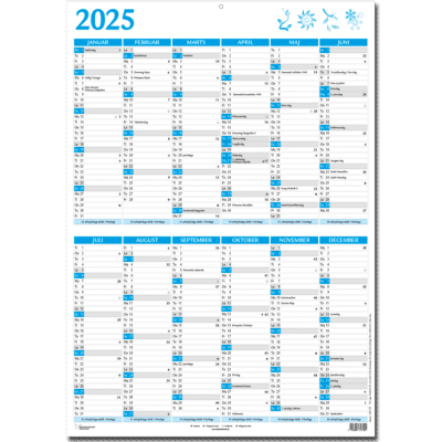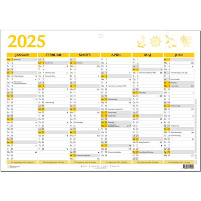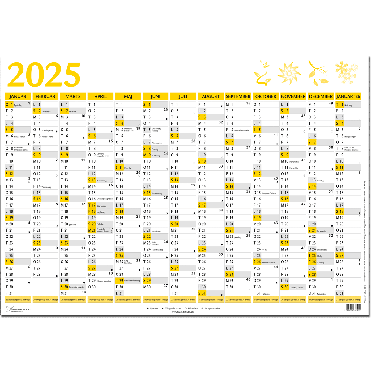 A2 vægkalender, januar 2025 – januar 2026, 13 måneders oversigt på 1 side. Gul. Format: 59,4 x 42 cm.
