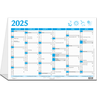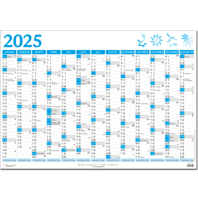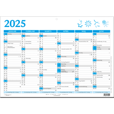 Den store A3 vægkalender i blå har første halvår af 2025 på den ene side og andet halvår 2025 på den anden side.