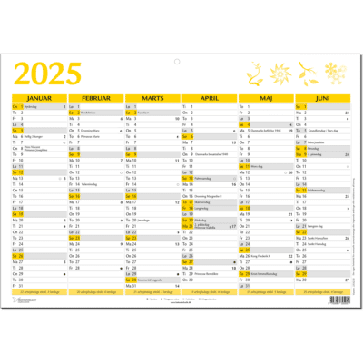 I den store kalender er alle årets helligdage samt nogle af årets vigtige datoer sat ind og markeret med blåt. Derudover er alle søndage for året markeret med blå.