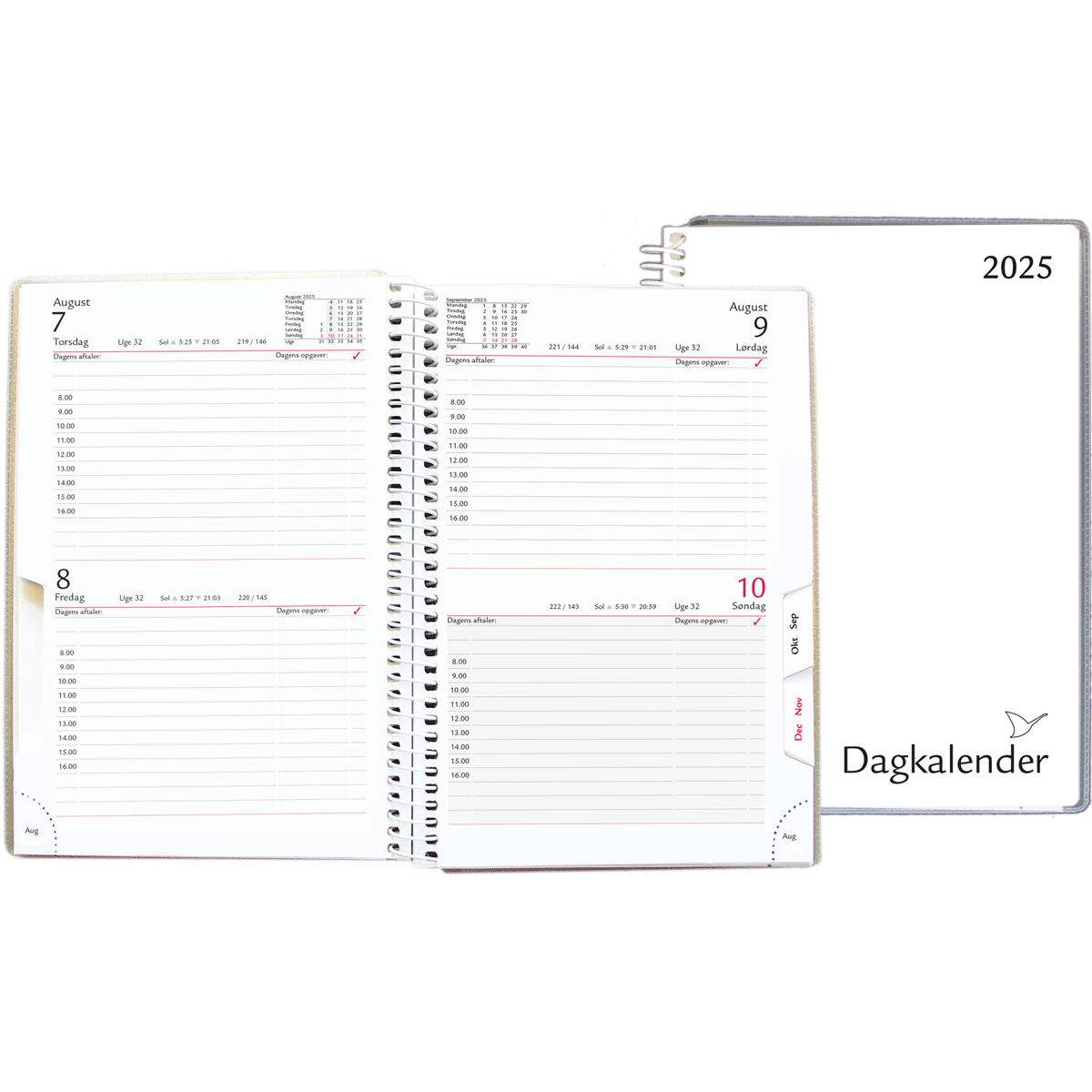 Spiralkalender med 2 dage pr. side. Timeinddeling fra kl. 8.00-16.00. Faner og afrivningshjørner. Månedskalendere indeværende og efterfølgende år. Infosider. Miljøvenligt omslag.