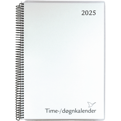 Spiralkalender med 2 dage pr. side. Timeinddeling fra kl. 8.00-16.00. Faner og afrivningshjørner. Månedskalendere indeværende og efterfølgende år. Infosider. Miljøvenligt omslag.