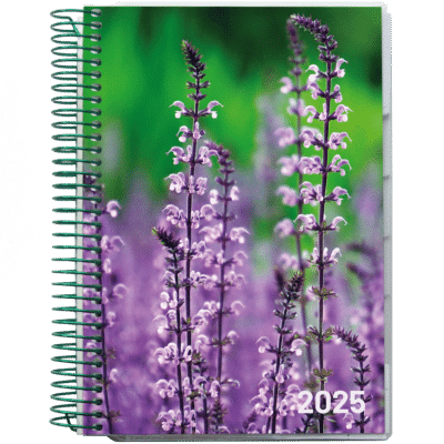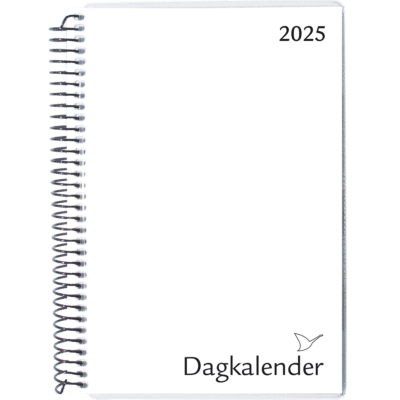 Spiralkalender med 2 dage pr. side. Timeinddeling fra kl. 8.00-16.00. Faner og afrivningshjørner. Månedskalendere indeværende og efterfølgende år. Infosider. Miljøvenligt omslag.