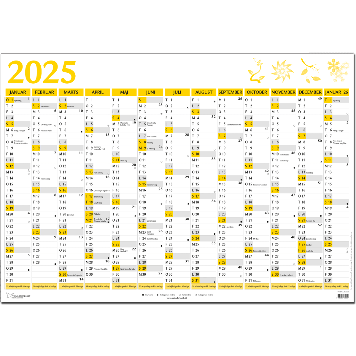 13 måneders oversigt med god skriveplads, januar 2025 – januar 2026. Gul. Format: 98 x 68,5 cm.