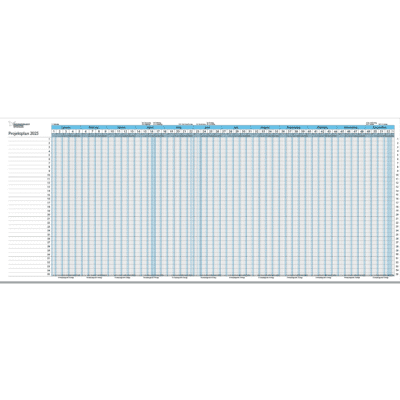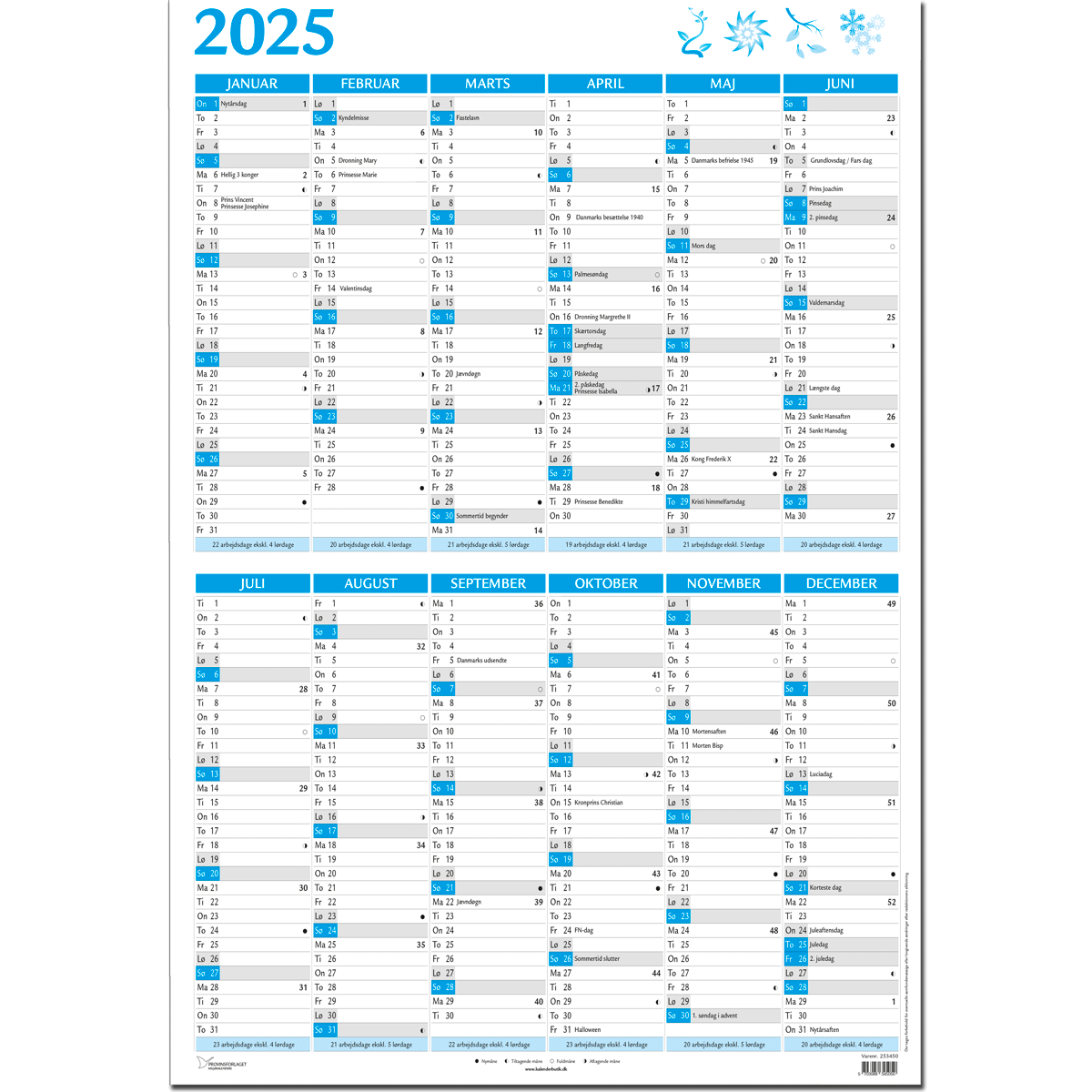 Dobbelt A2 kalender med 1. og 2. halvår på en side. Blå. Format: 68,5 x 98 cm.