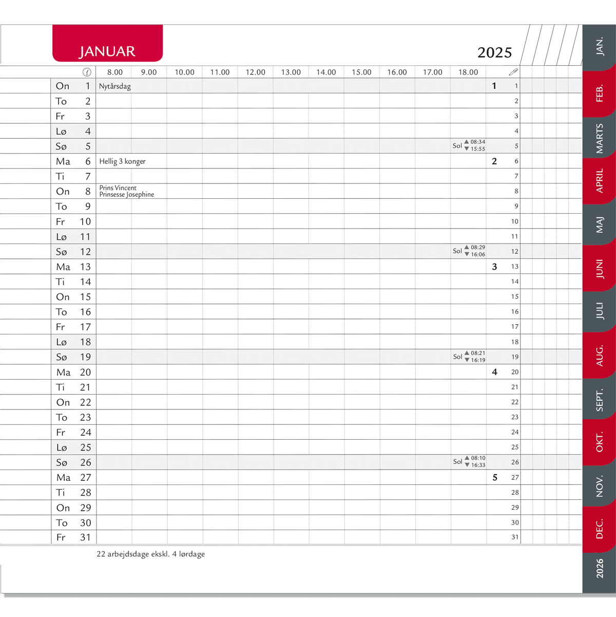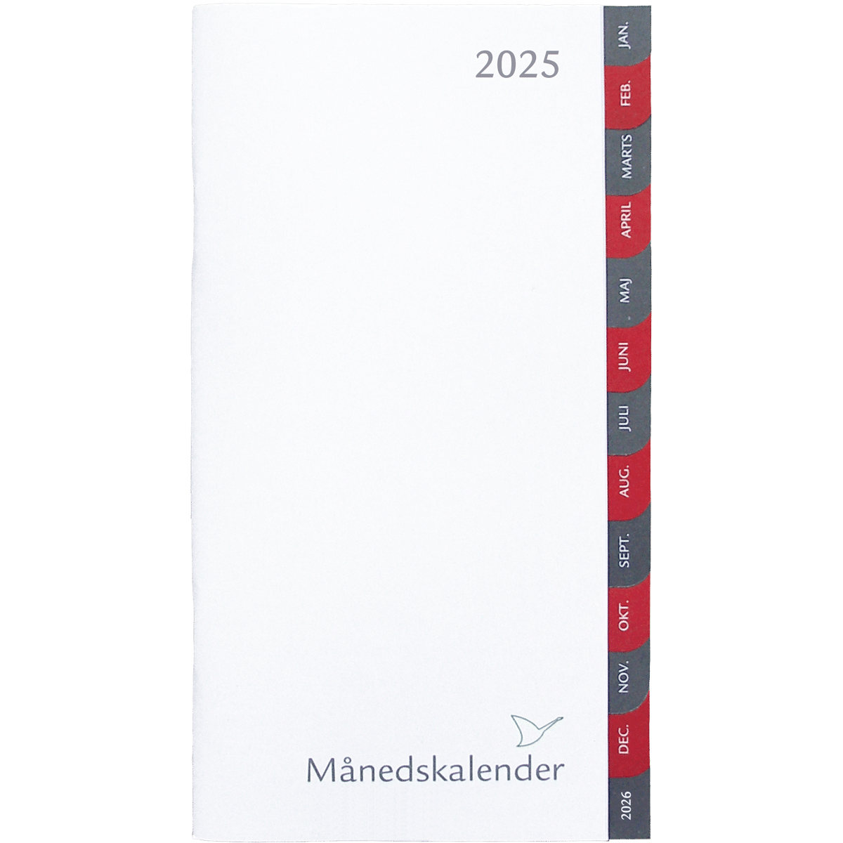 Månedskalender med rød/grå faner. Der er 1 mdr. pr. opslag. Årsoversigt over indeværende samt efterfølgende år. Format: 9,2 x 16,9 cm.