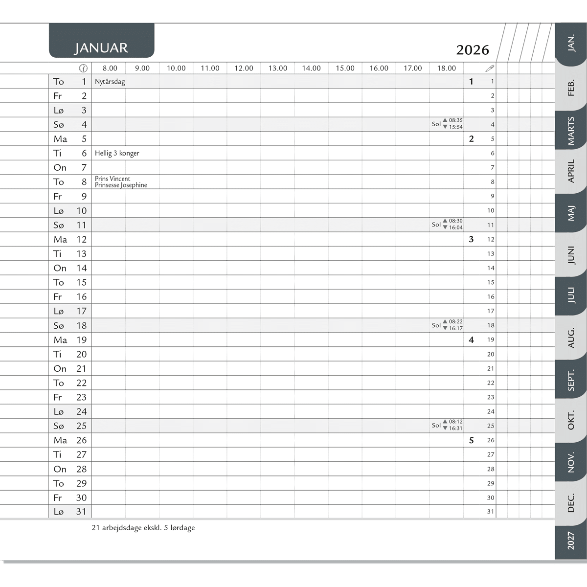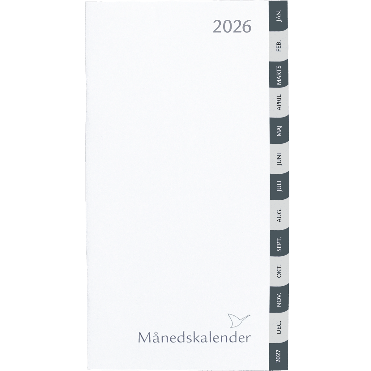 Månedskalender med grå/grå faner. Der er 1 mdr. pr. opslag. Årsoversigt over indeværende samt efterfølgende år. Format: 9,2 x 16,9 cm.