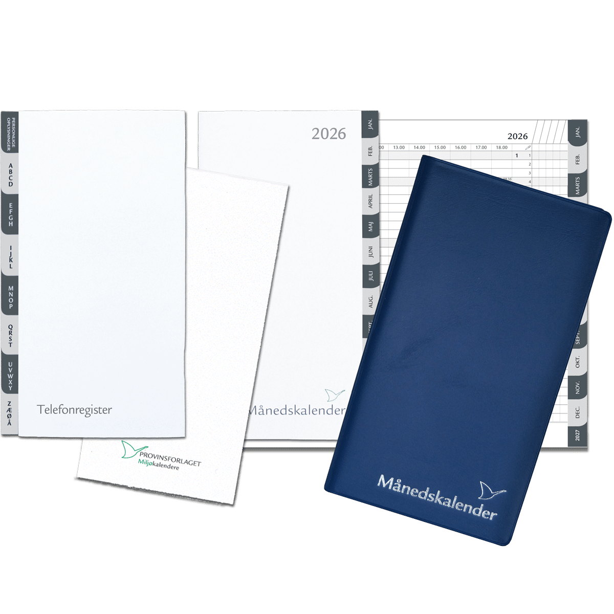 Månedskalenderen er med blåt omslag og lige til at have liggende i tasken eller i skuffen.