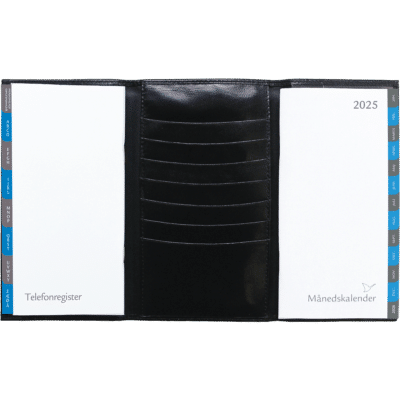 Månedskalenderen er med blåt omslag og lige til at have liggende i tasken eller i skuffen.