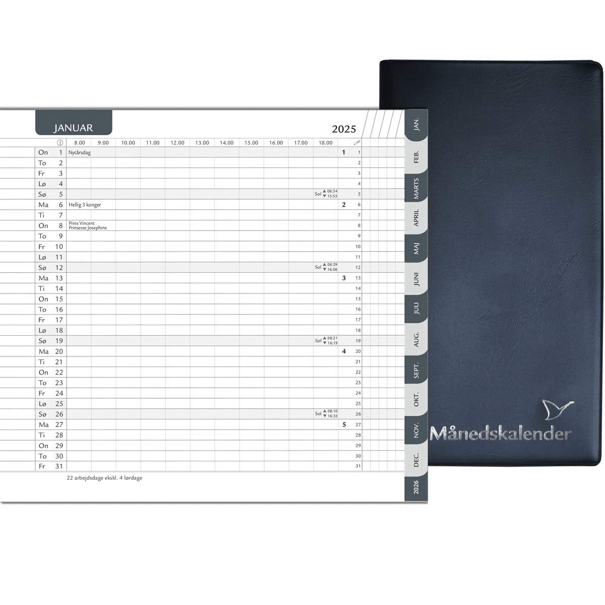 Den praktiske kalender er inddelt med lyse- og mørkegrå faner, der giver et nemt overblik over de forskellige måneder på året.