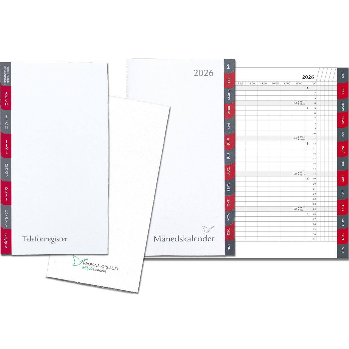 Refillsæt med månedskalender, telefon og adresseregister samt blok. Rød/grå faner