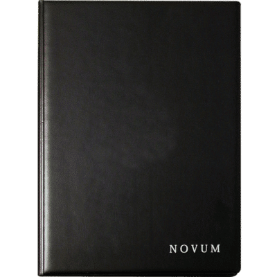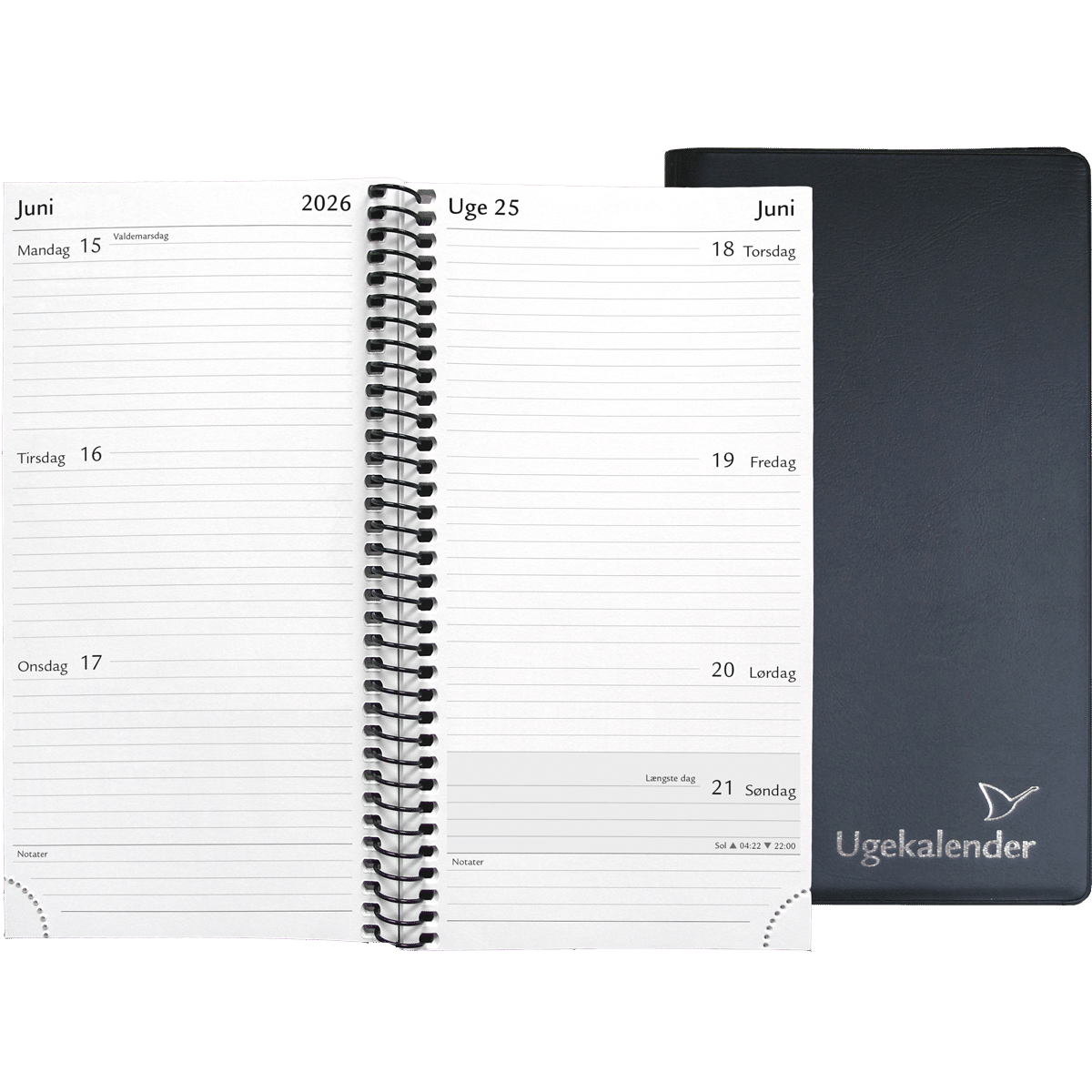 Sort omslag med spiral ugekalender med god skriveplads. Månedsoversigt efterfølgende år samt infosider med praktiske oplysninger og udfoldningskalender. Format: 10,0 x 17,4 cm.