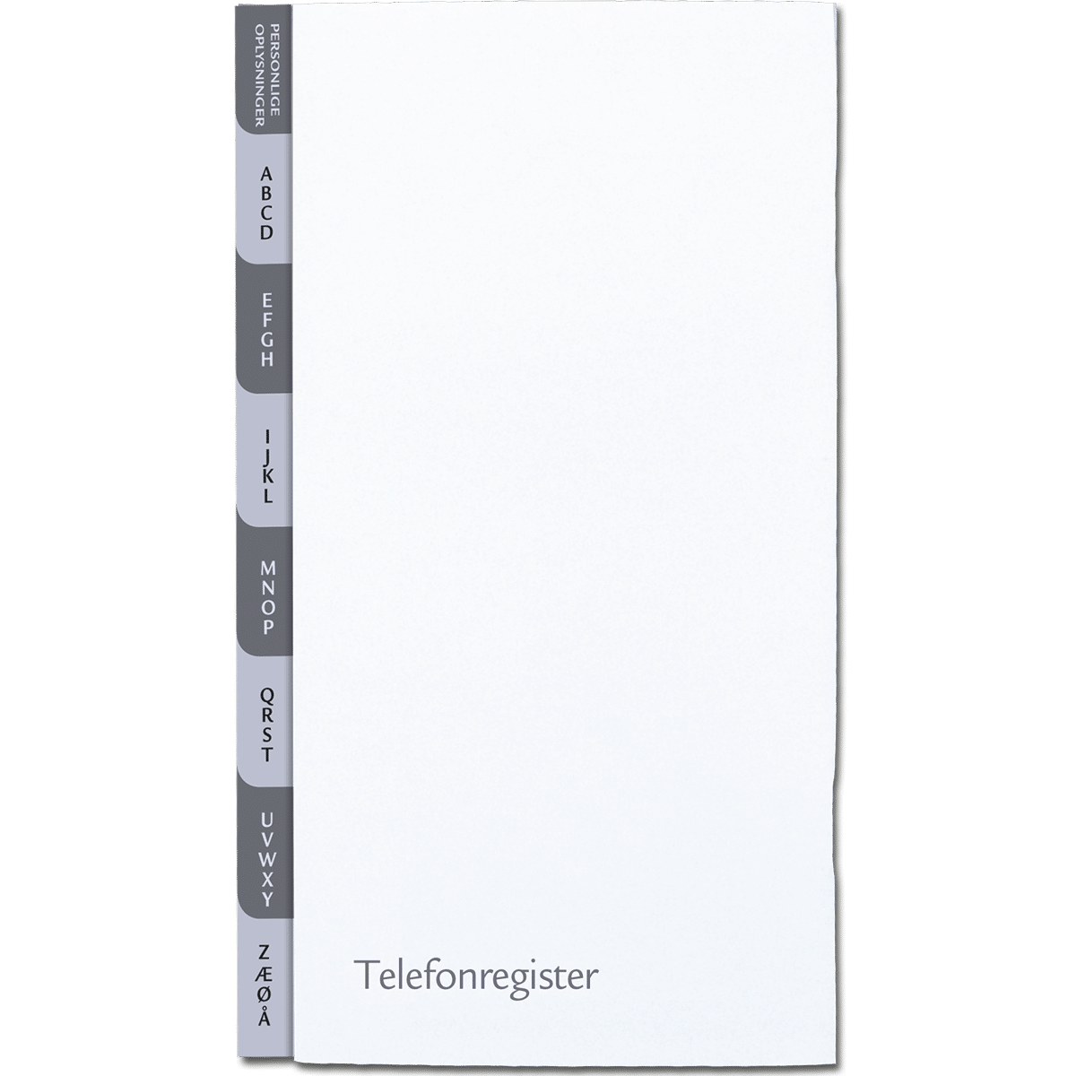 Telefonregister med 16 sider og grå/grå faner A-Å. Format: 9,2 x 16,9 cm.