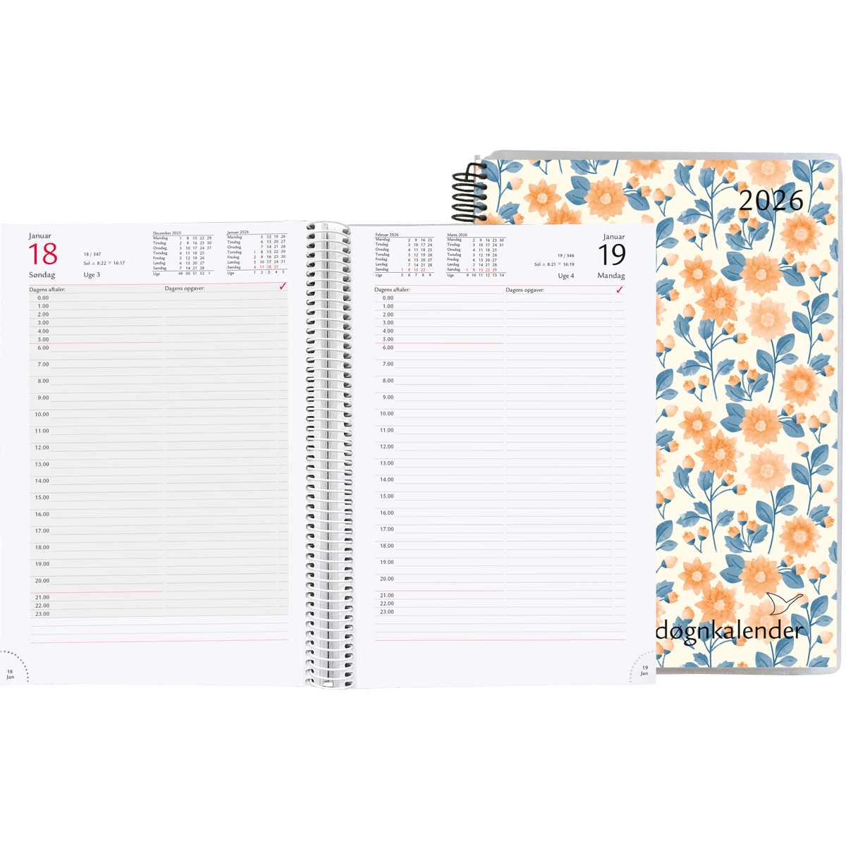 For dem der skal planlægge alle døgnets 24 timer. Kolonne til dagens aftaler og opgaver samt notater. Spiralkalender med 1 dag pr. side. Månedskalender for indeværende og efterfølgende år foran i kalenderen, samt postnummerfortegnelse, telefon selvvalg og særtjenestenumre. Miljøvenligt omslag med flot motiv.