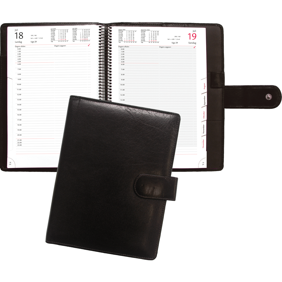 Time/døgnkalender indsat i mørkebrunt skindomslag.