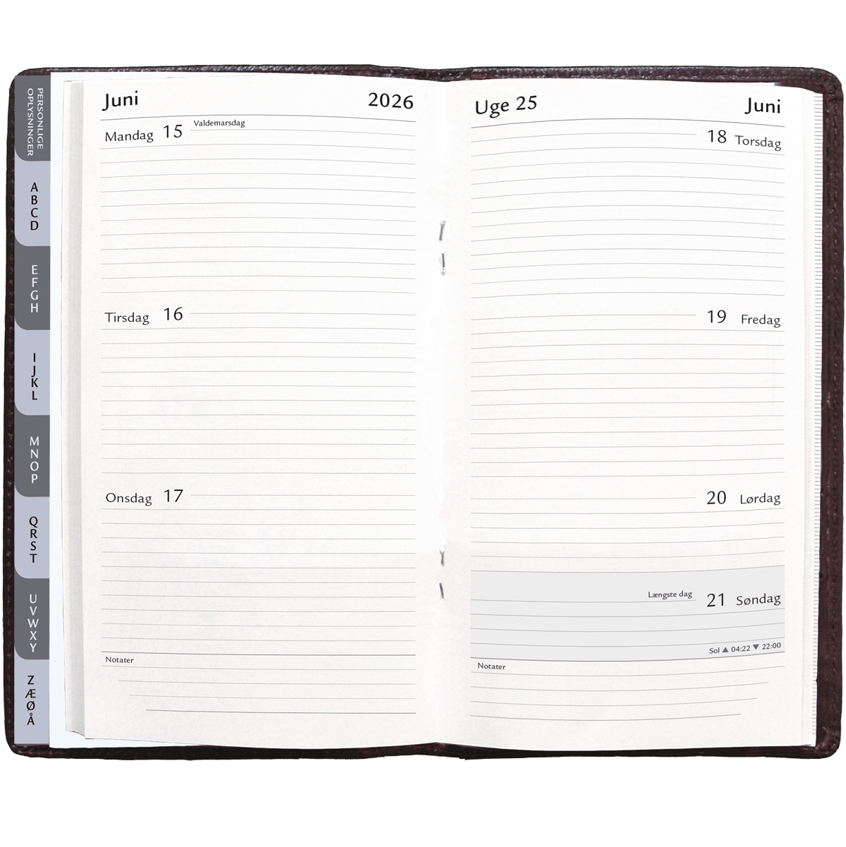 Klammehæftet ugekalender i 2 fløjet brunt skindomslag med blok og telefonregister. Format omslag: 10,5 x 18,2 cm