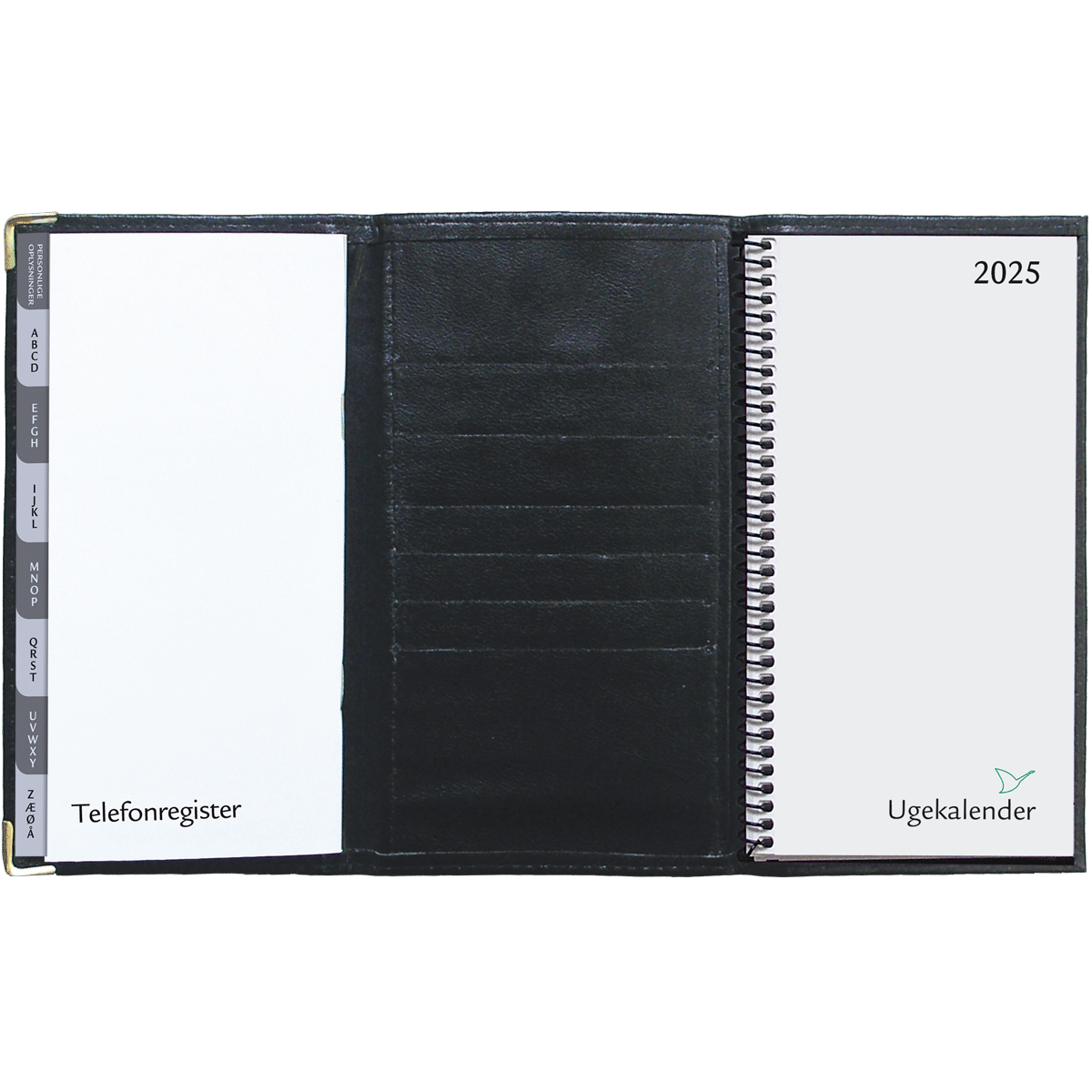 Spiral ugekalender i 3 fløjet sort kunstlæderomslag med blok og telefonregister. Format omslag: 10,5 x 18,2 cm